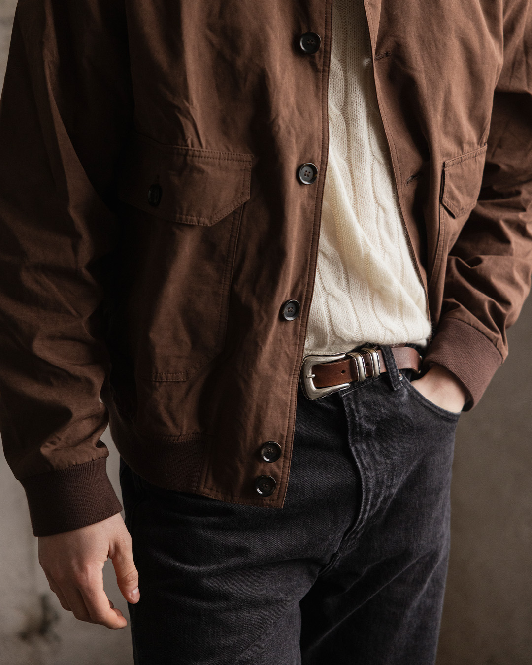 The jacket is where color truly gets to showcase its strength. A brown jacket often ages beautifully and gains more life over time, especially in materials like wool, cotton, or suede. The style-conscious dare to pair black trousers with brown loafers, creating a contrast. Just because you're styling brown with brown doesn't mean every piece and detail needs to be brown; we don't have to go overboard. We break it up with a cream-colored knitted sweater that also adds an earthy tone.